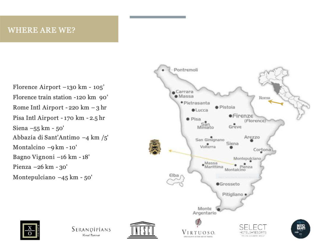 Från Siena: Kör via Cassia i riktning mot Montalcino och Castelnuovo dell’Abate.Närmaste flygplatser