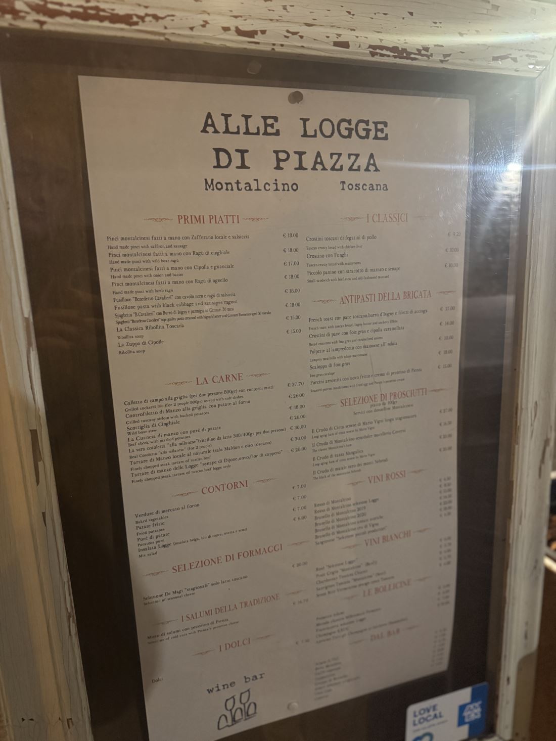 Mitt på Piazza del Popolo i Montalcino ligger Alle Logge di Piazza, inrymd i den historiska loggian med utsikt över torget. Här möts historia och modern toskansk matlagning i en elegant och avslappnad atmosfär. Perfekt för ett glas vin, en lång lunch eller en middag medan solen går ner över stadens takåsar.